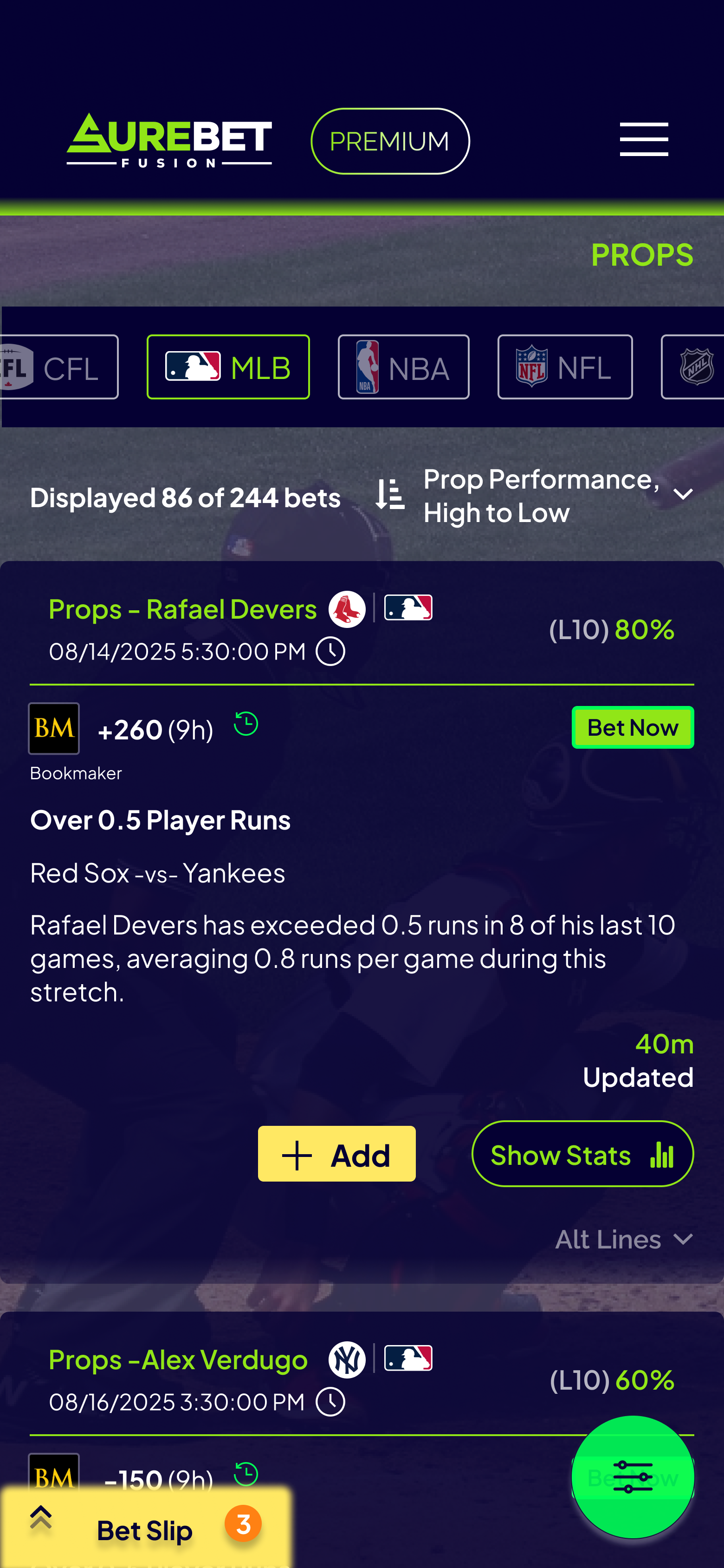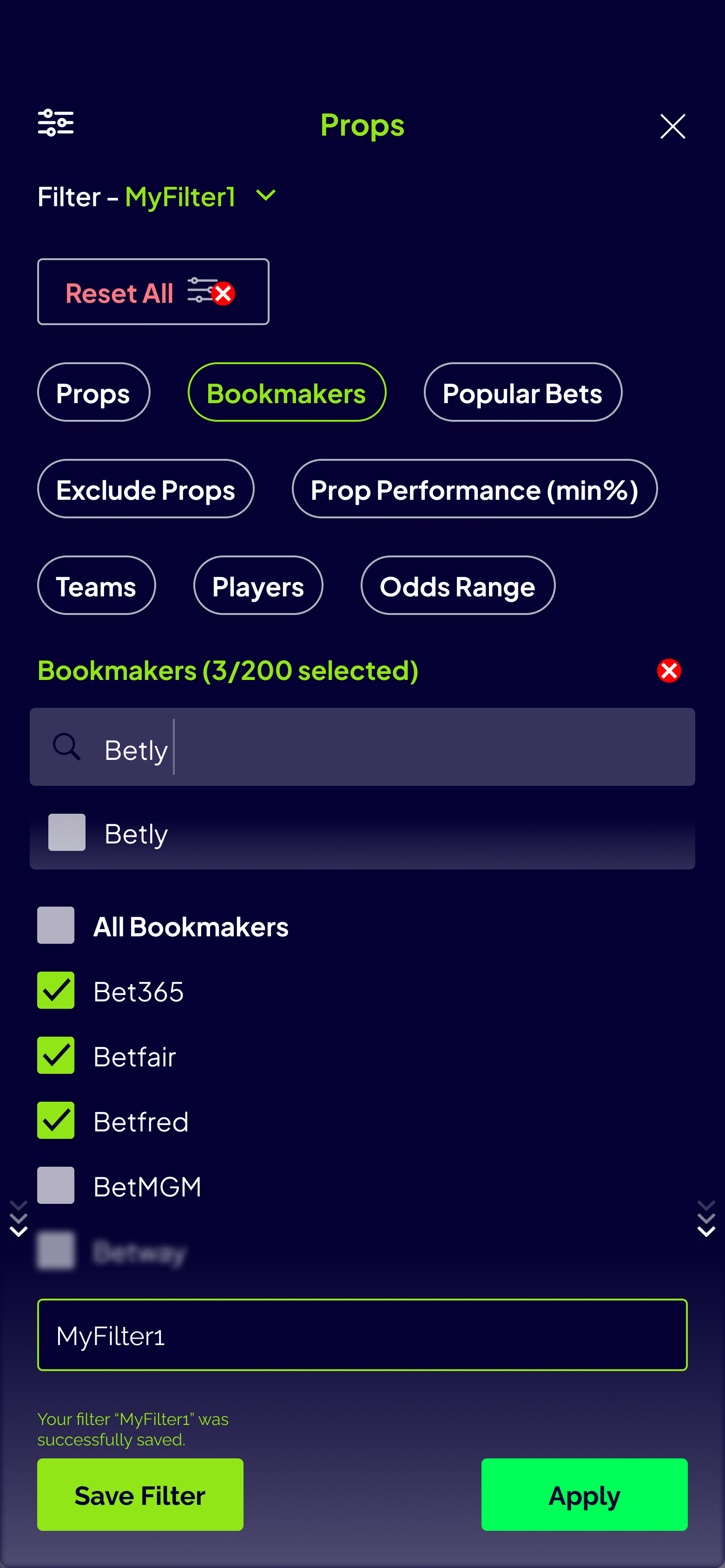 The props betting interface features advanced filtering capabilities, allowing users to quickly narrow down betting options by sport, bookmaker, player, and bet type. Real-time odds are displayed with clear visual indicators for value bets, accompanied by AI-generated insights and historical performance data to inform betting decisions.