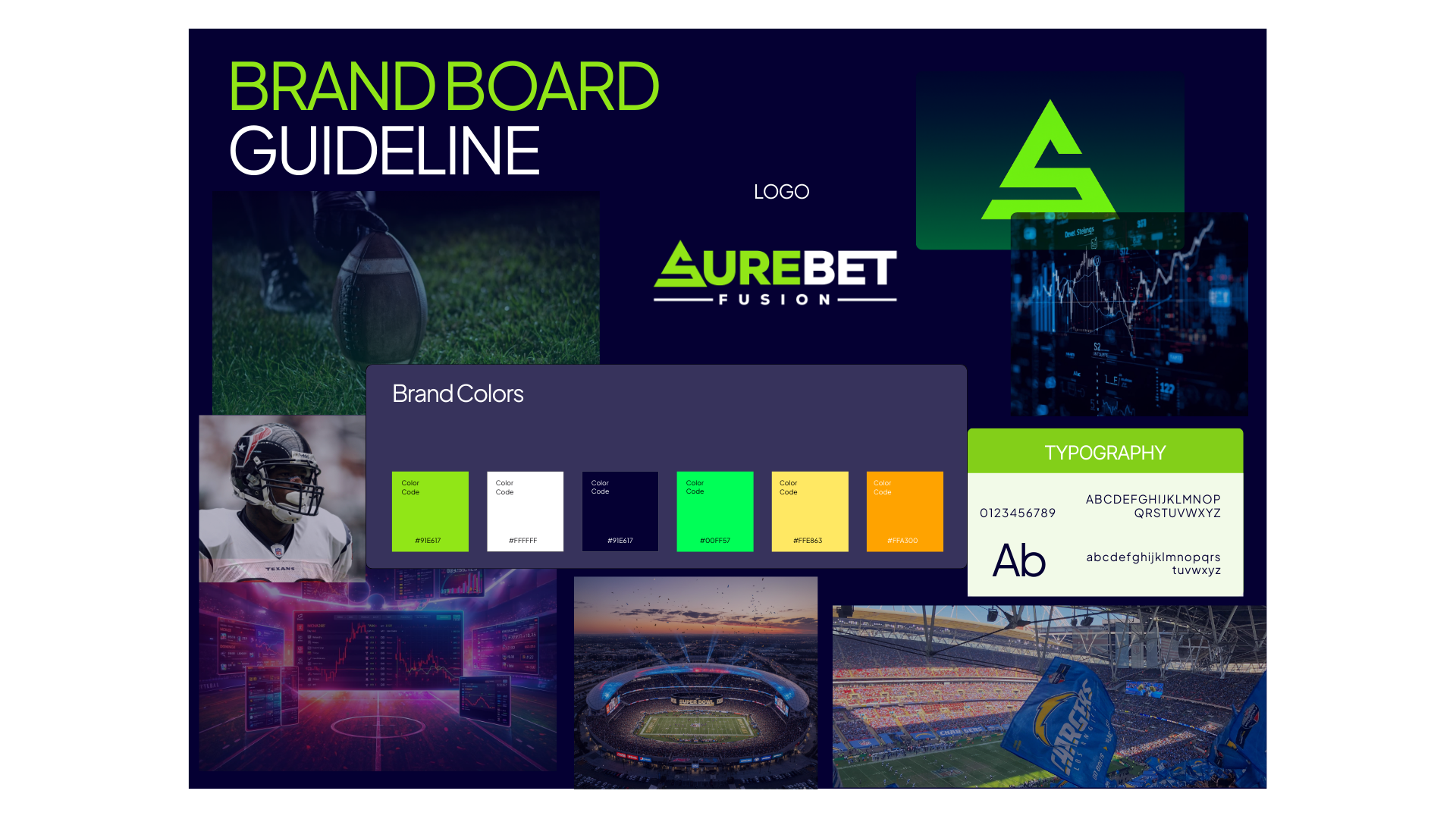 Brand identity exploration featuring the core color palette (vibrant green #91E617 and deep navy #050033), Plus Jakarta Sans typography system, and visual references from major sports leagues including NFL, MLB, and NHL. The moodboard establishes the modern, tech-forward aesthetic that defines SureBet Fusion's visual language.