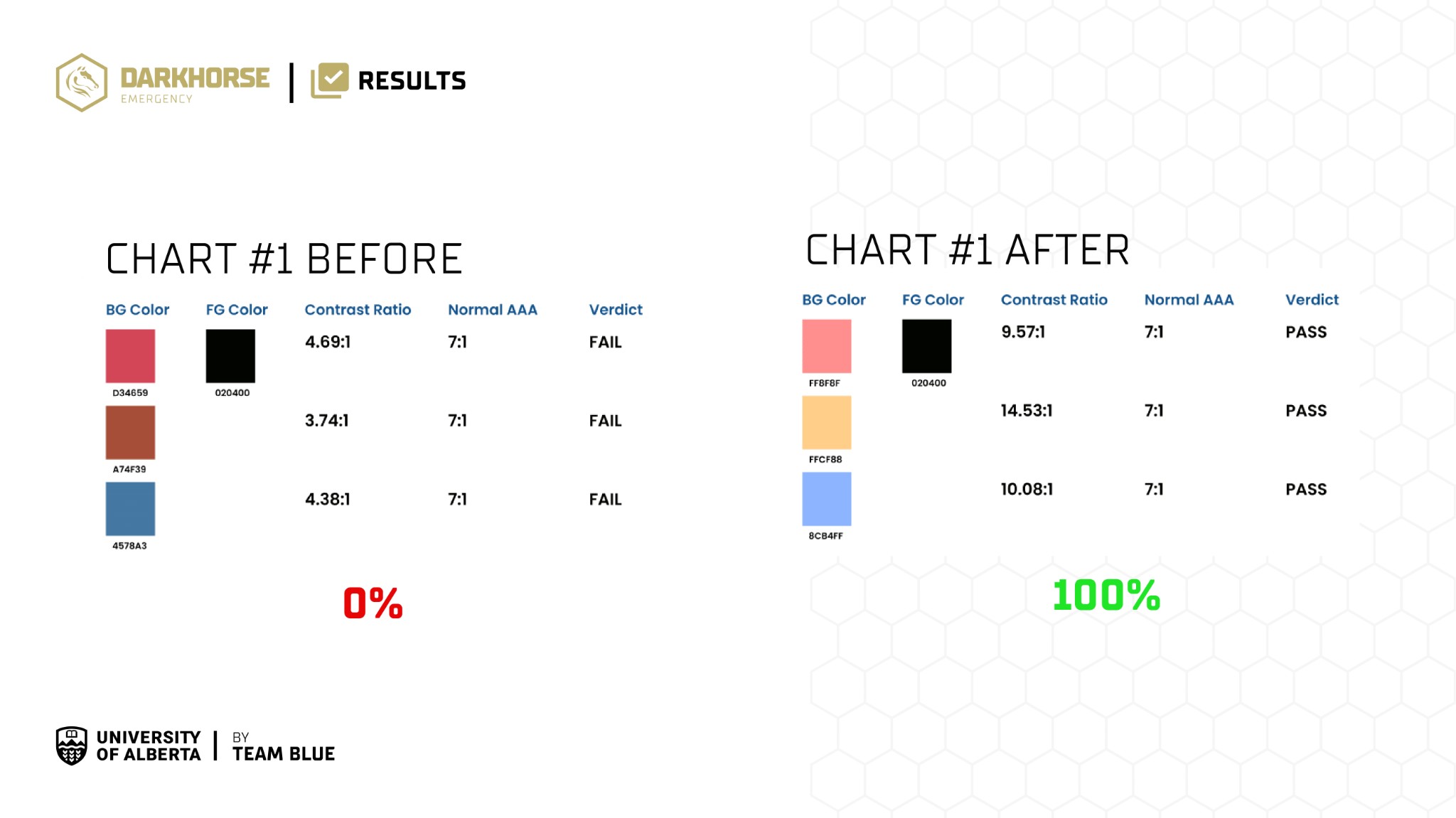 Contrast ratio evaluation — before (0% pass) vs after (100% pass) for WCAG AAA